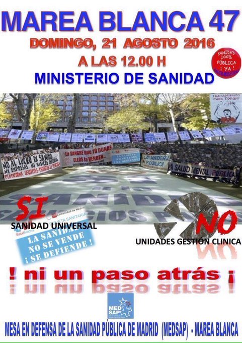 La Sanidad Pública difícilmente sobrevirá a 4 años más de gobierno del PP - 21 AGO MANI por MAREA BLANCA